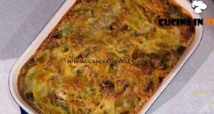 Nella puntata odierna di martedì 30 settembre della trasmissione di cucina di Rai Uno dal titolo È sempre mezzogiorno condotta da Antonella Clerici, Andrea Mainardi ci ha proposto l’interessante ed appetitosa ricetta dal titolo Polpettone di patate filante. Foto tratta dalla trasmissione di cucina È sempre mezzogiorno in onda su …